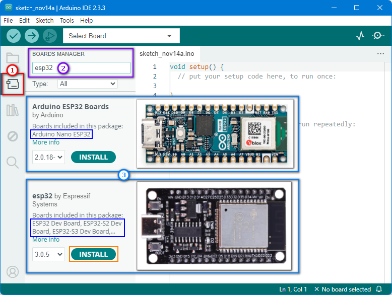 ③ esp32 보드가 Arduino에서 만든 Arduino Nano ESP32 라면 Arduino ESP32 Boards 의 INSTALL을 누르고,