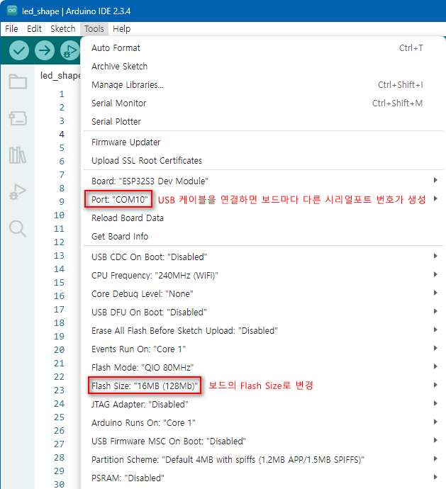 기본 개발 모듈을 선택하면 Flash Size를 자신의 모듈에 맞게 변경해 주어야 합니다.