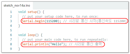 위 예제에서는 시리얼 통신을 초기화했습니다.