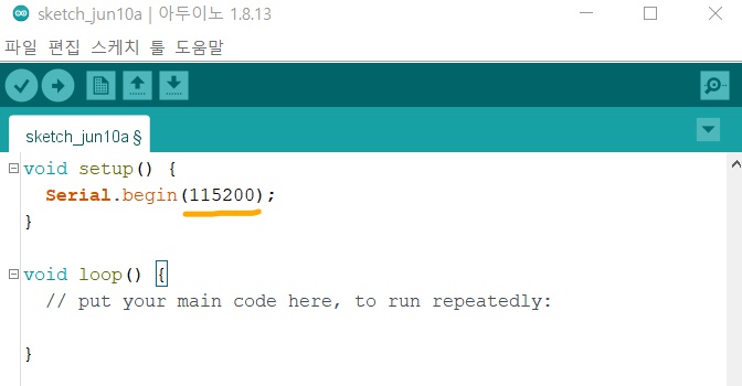 시리얼 모니터의 보드레이트를 코드상에서 설정한 보드레이트 (115200) 와 동일하게 설정해야 합니다.