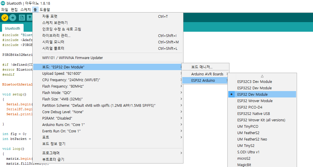 ⑤ ESP-32 Dev Module 보드를 선택합니다.